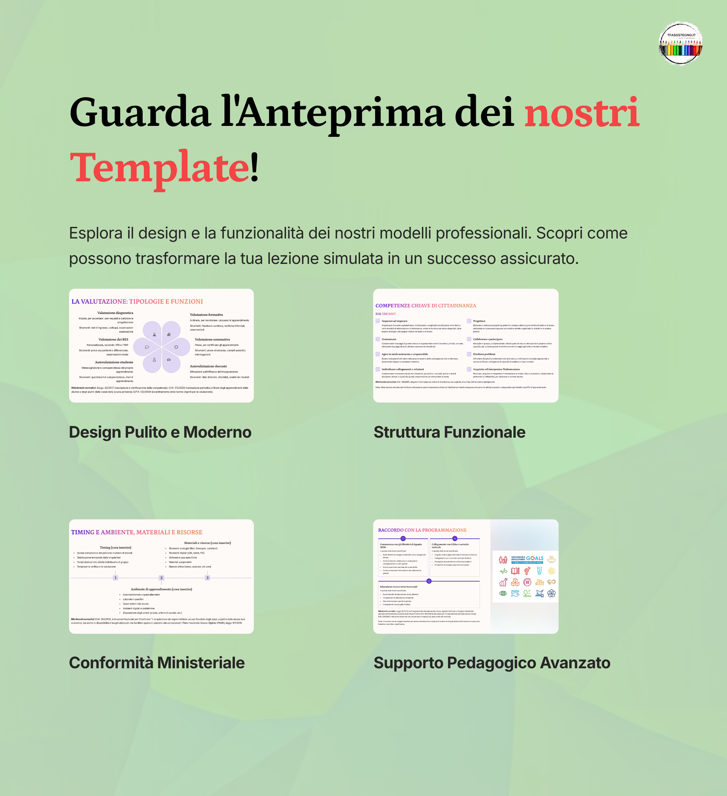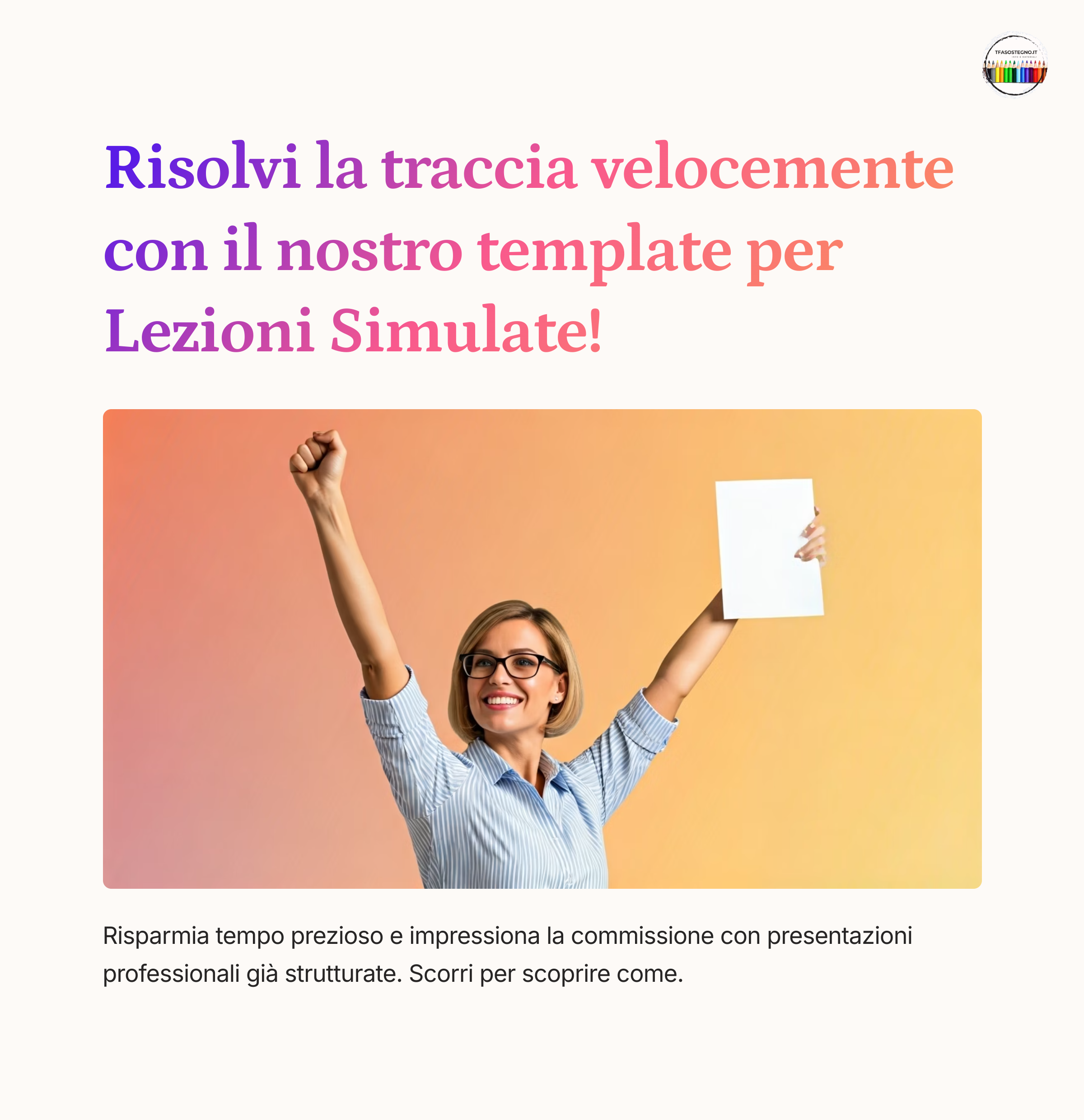 Il Template per la Lezione Simulata rappresenta uno strumento indispensabile per tutti i candidati che si preparano al concorso docenti o ai percorsi abilitanti 30-60 CFU. Questo modello completo, curato da docenti esperti in pedagogia, metodologie e normativa, offre una struttura metodologica precisa e conforme alle linee guida ministeriali per progettare e presentare una lezione simulata efficace e vincente.