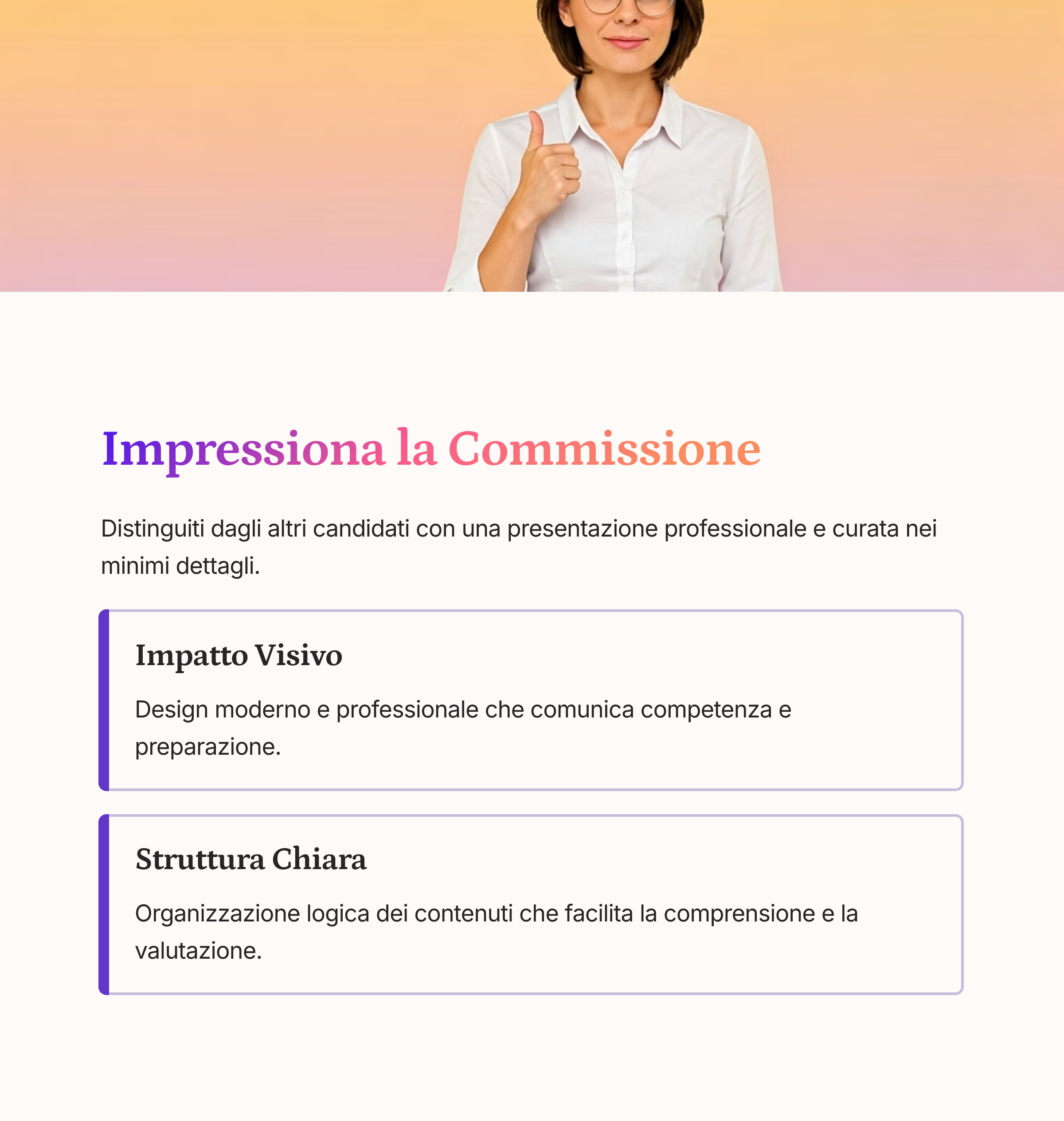 Preparazione Mirata: Ogni slide è progettata per rispondere ai criteri di valutazione della commissione secondo il D.M. 649/2023